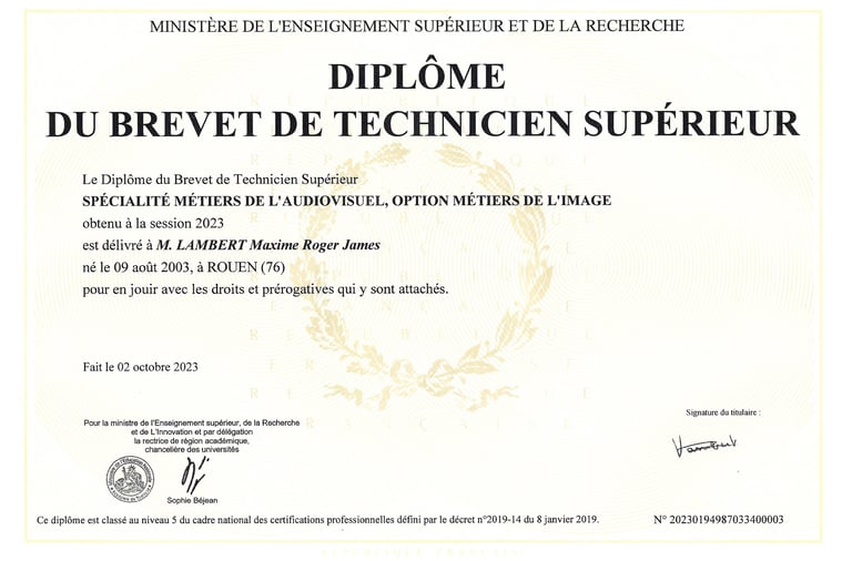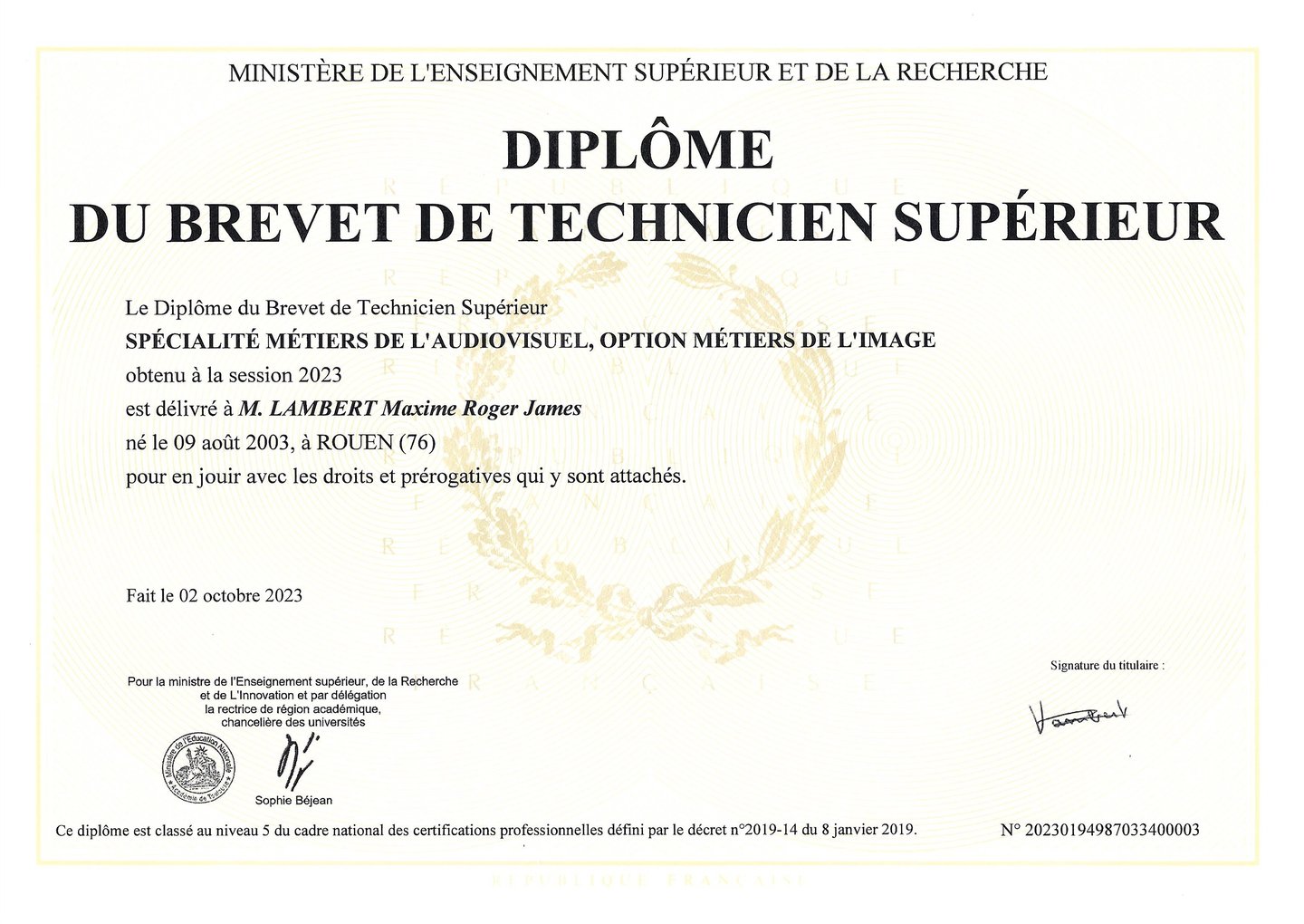 A 20 ans, je deviens diplômé d'un BTS Métiers de l'Audiovisuel spécialité Image, c'est-à-dire la captation vidéo lors du tournage ainsi que l'étalonnage en post-production.